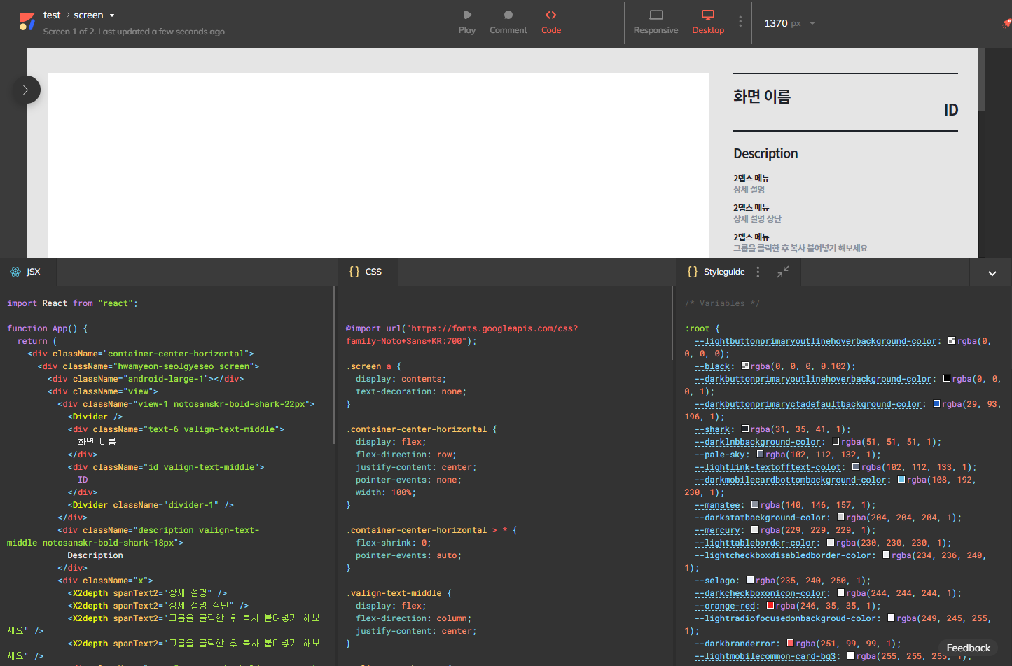 위처럼 작업한 디자인 화면을 React의 jsx 문법에 맞게 코드화 된 값을 확인할 수 있습니다.