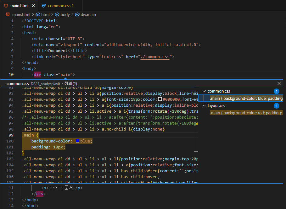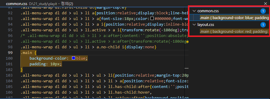 일부로 css파일에 여러 내용을 넣어놓고 테스트 해본 결과, 해당 class가 정의된 위치를 잘 쫒아가 보여주는 모습니다.