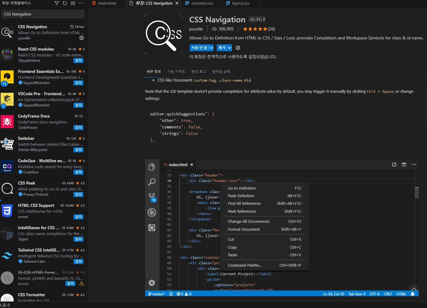 설치하는 방법은 간단하다. VS Code 확장 프로그램에서 CSS Navigation을 검색한 후 설치하면 된다.