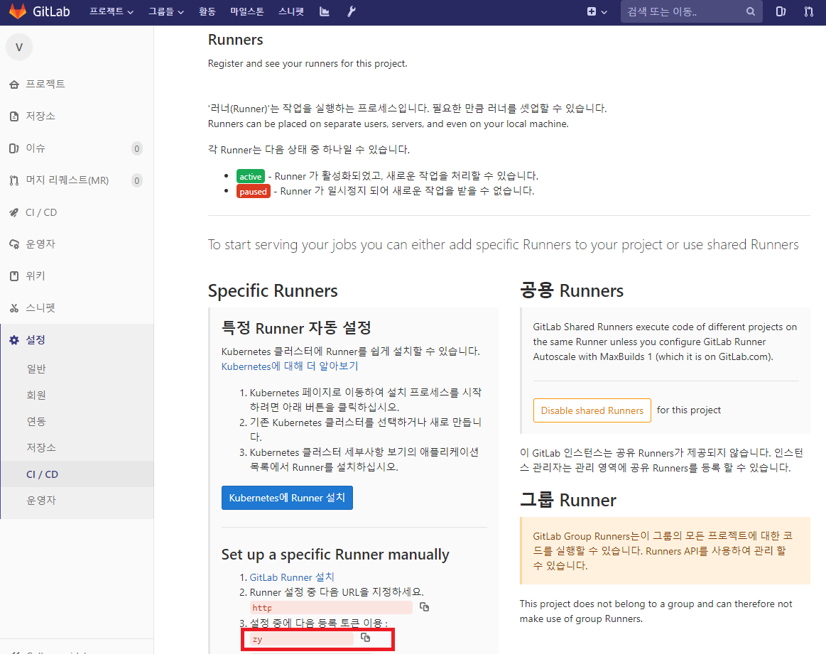 2.gitlab 설정 ci/cd 토큰 값 입력