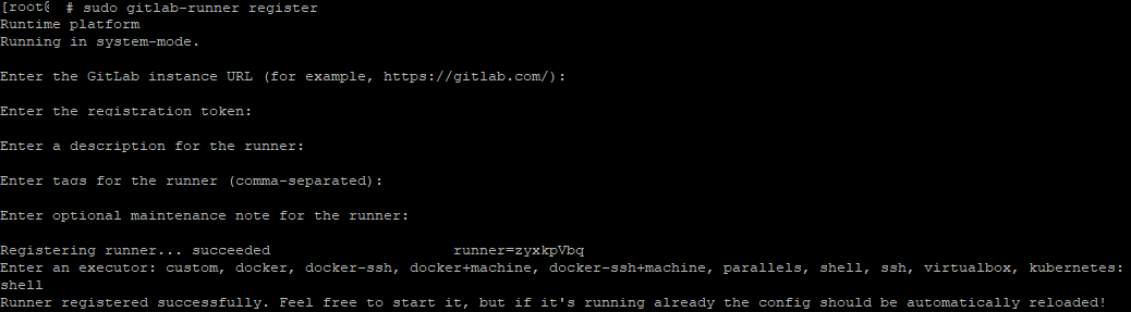 - Enter an executor: custom, docker, docker-ssh, docker+machine, docker-ssh+machine, parallels,